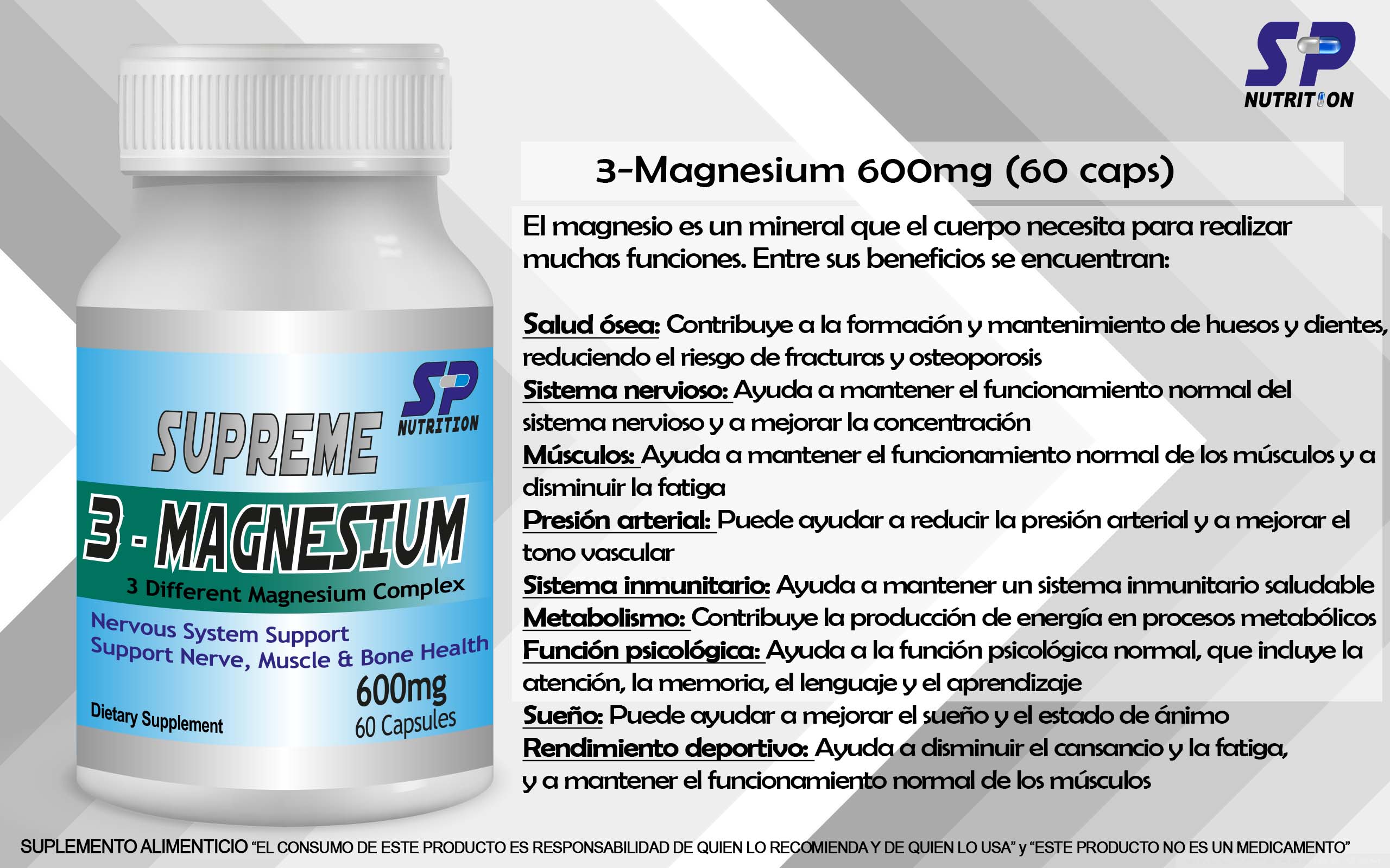 El magnesio es un mineral que el cuerpo necesita para realizar muchas funciones. Entre sus beneficios se encuentran: Salud ósea: Contribuye a la formación y mantenimiento de huesos y dientes, reduciendo el riesgo de fracturas y osteoporosis Sistema nervioso: Ayuda a mantener el funcionamiento normal del sistema nervioso y a mejorar la concentración Músculos: Ayuda a mantener el funcionamiento normal de los músculos y a disminuir la fatiga Presión arterial: Puede ayudar a reducir la presión arterial y a mejorar el tono vascular Sistema inmunitario: Ayuda a mantener un sistema inmunitario saludable Metabolismo: Contribuye la producción de energía en procesos metabólicos Función psicológica: Ayuda a la función psicológica normal, que incluye la atención, la memoria, el lenguaje y el aprendizaje Sueño: Puede ayudar a mejorar el sueño y el estado de ánimo Rendimiento deportivo: Ayuda a disminuir el cansancio y la fatiga, y a mantener el funcionamiento normal de los músculos