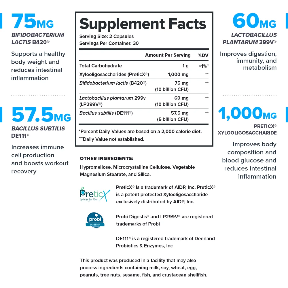 Nuestro probiótico proporciona dosis clínicamente efectivas de 4 ingredientes evaluados en laboratorio, científicamente demostrados para aliviar molestias digestivas, apoyar bacterias intestinales saludables y promover una composición corporal más delgada.