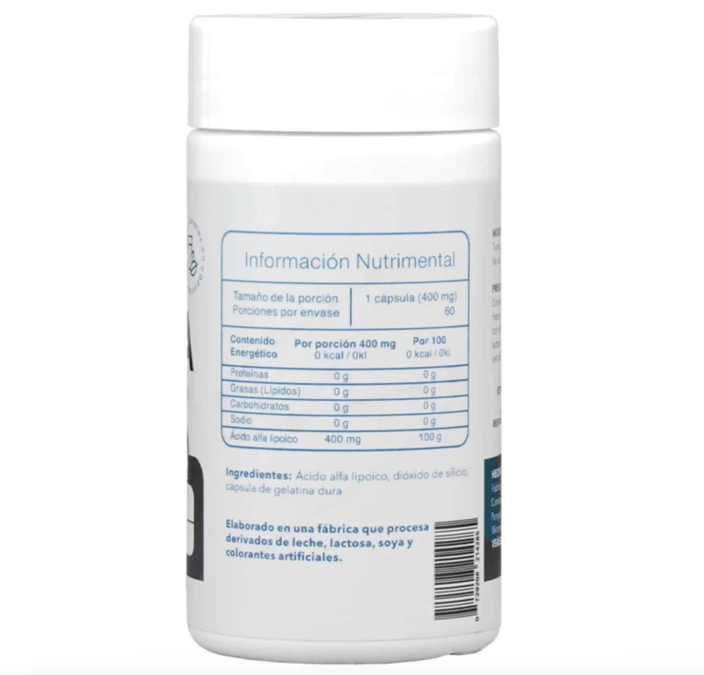 Suplemento de Ácido Alfa Lipoico (forma R+, 400 mg por cápsula), un antioxidante potente que participa en reacciones metabólicas, apoya la neutralización de radicales libres y favorece el mantenimiento de funciones celulares saludables.