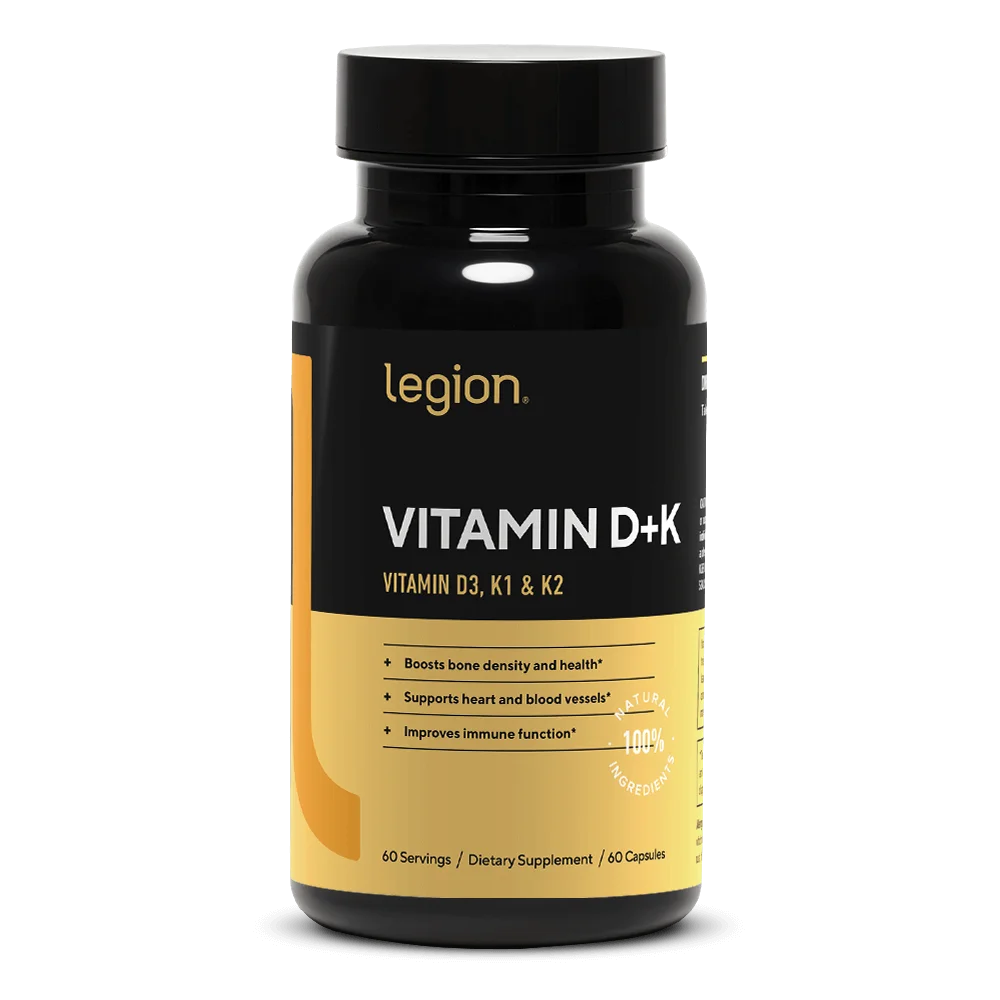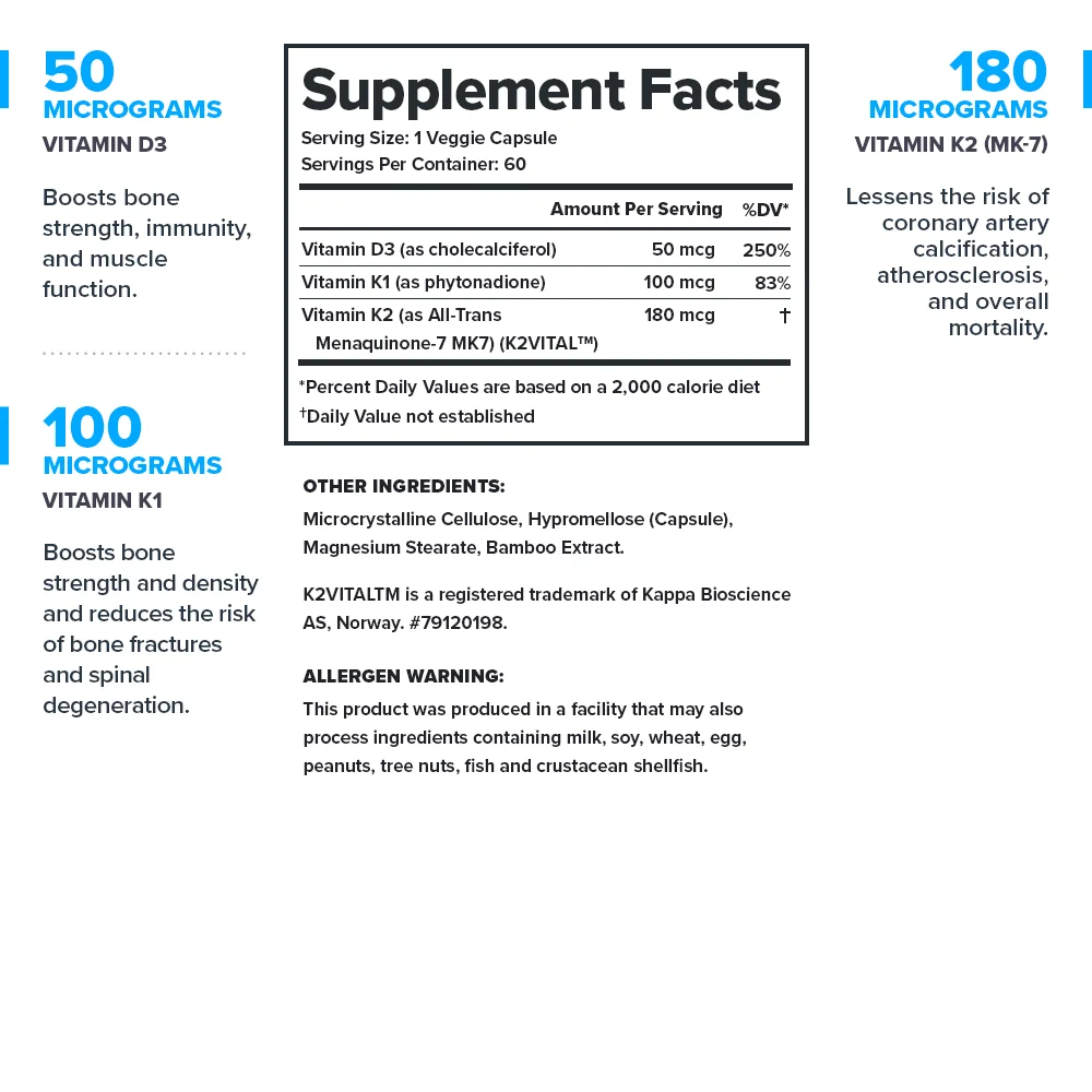 Nuestro suplemento Vitamin D+K proporciona una dosis clínicamente efectiva de 3 ingredientes analizados en laboratorio que han demostrado científicamente apoyar la salud ósea y cardiovascular, así como la función muscular e inmunológica, mejor que la vitamina D sola.